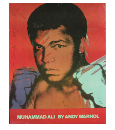 A colour reproduction of Muhammad Ali by Andy Warhol, signed and inscribed in black felt pen to Dali, Andy Warhol -- 30x24in. (76.2x61cm.)